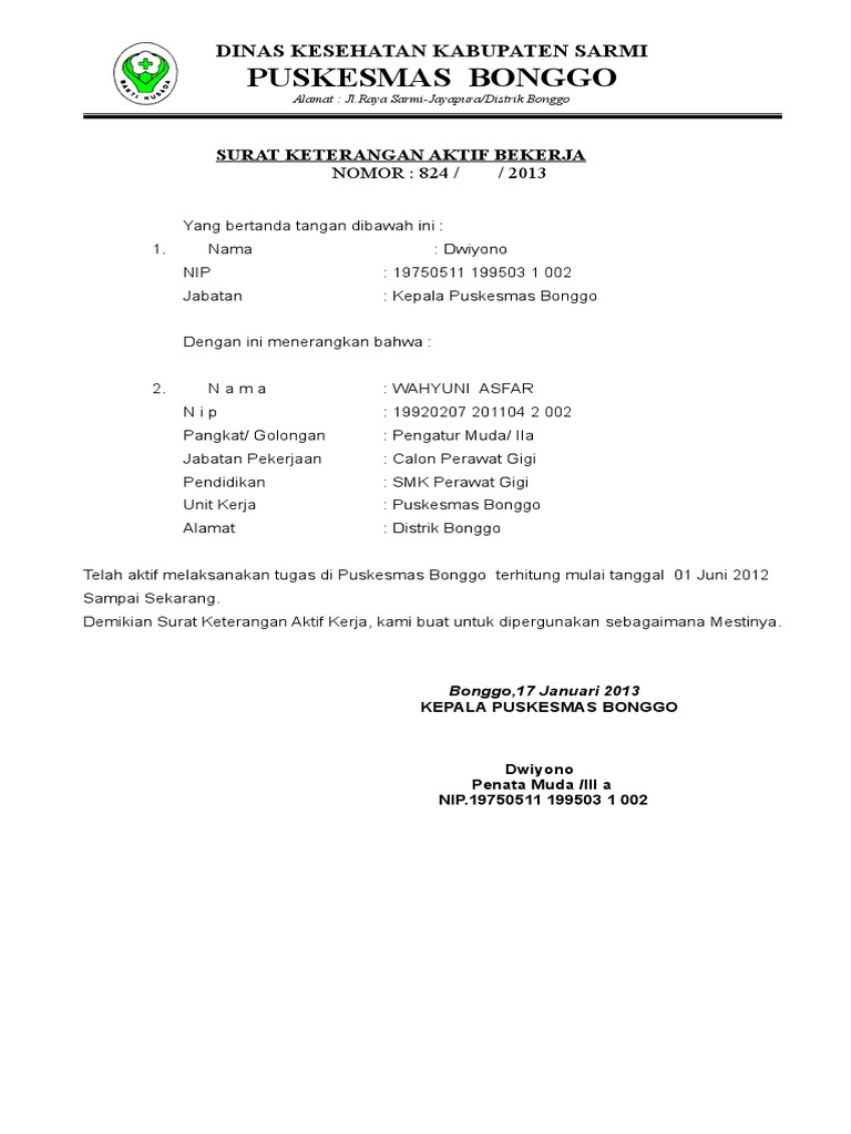 Contoh surat keterangan kerja surat keterangan kerja di gunakan karyawan atau seseorang yang memiliki ikatan kerja untuk memberikan penjelasan atau informasi bahwasanya dia adalah sebagai pekerja dan sedang bekerja dengan. Misalnya, bila surat keterangan bekerja itu dibutuhkan untuk melamar kerja ke tempat lain, pimpinan perusahaan sebelumnya hendaknya juga mencantumkan prestasi kerja dari karyawan yang bersangkutan. Surat ini umumnya dibuat untuk melengkapi persyaratan seperti. Terima kasih telah berkunjung ke blog kumpulan surat penting 2019. Sekian yang admin bisa bantu mengenai contoh surat keterangan pengalaman kerja di puskesmas.