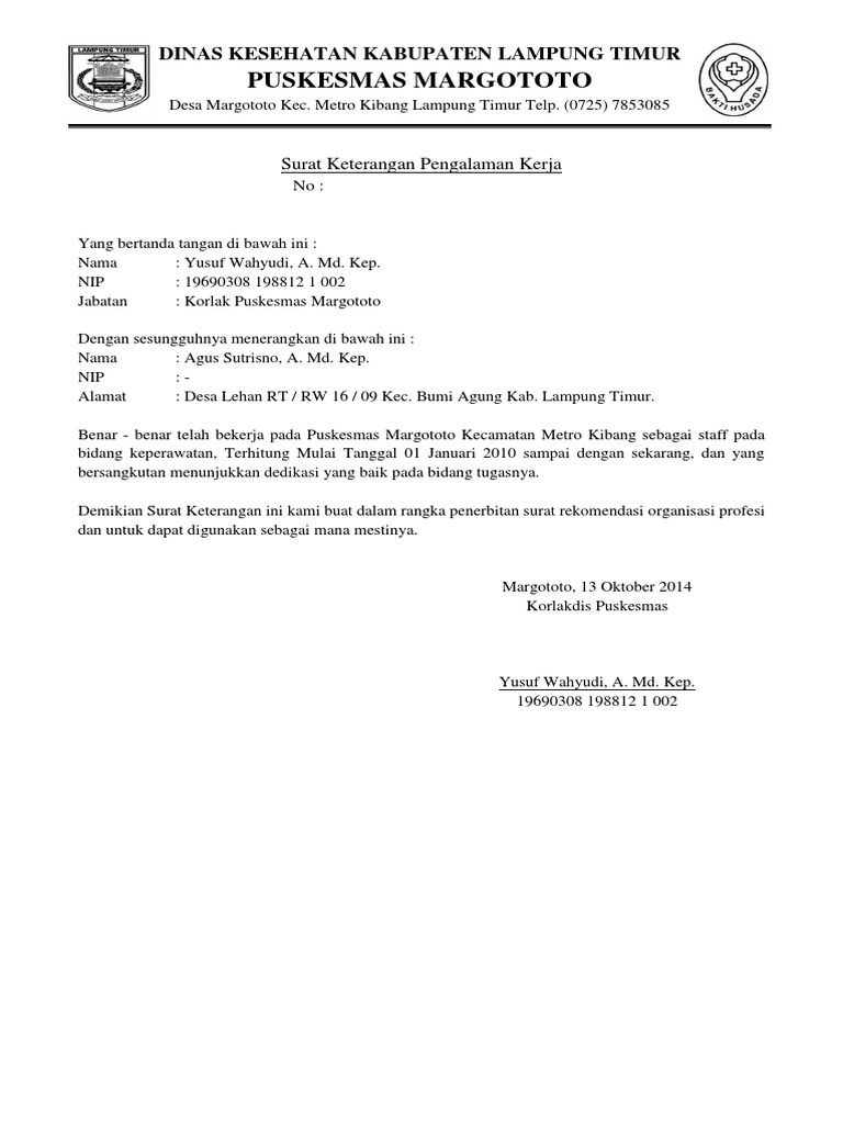 Contoh Surat Keterangan Pernah Bekerja Di Puskesmas : 1 - Artikel contoh surat lamaran kerja perawat di klinik dan puskesmas.selamat datang kembali pada situs kita marketmedan.com semoga apa yang kita sampaikan ini dapat menjadi hal yang berguna kepada masyarakat.. Contoh surat pengalaman kerja bagi seseorang yang sudah pernah bekerja di suatu perusahaan dalam waktu tertentu kemudian berhenti mengundurkan diri sudah bisa mendapatkan surat pengalaman kerja. Kemudian agestya mencoba datang ke puskesmas yang berlokasi di sekitar kampus unnes. Contoh surat izin orang tua untuk bekerja dan keperluan lainnya. Begini cara mendapatkan surat keterangan sehat di. Terima kasih telah berkunjung ke blog kumpulan surat penting 2019.