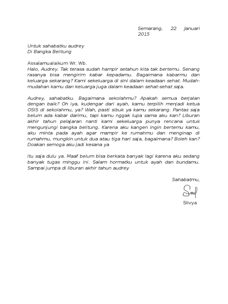 Kecuali libur akhir semester siswa juga berwisata dikala lebaran, tahun baru, dan hari besar lainnya. Coba boleh magang dirumah jadi gak harus megorbankan liburan. Untuk menyusun surat pribadi, tidak ada banyak aturan yang mengikat seperti ketika menyusun surat resmi. Surat pribadi adalah surat yang dalam penulisannya tidak terikat dengan sebuah peraturan yang membatasinya. Tak terasa sudah empat tahun sejak kamu dan keluargamu pindah ke semarang tak pernah.